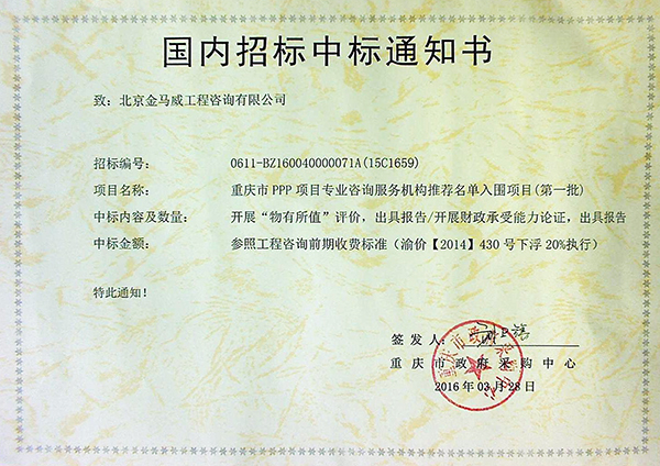 3月28日,北京金馬威工程咨詢有限公司經重慶市政府采購中心評審,中標重慶市PPP項目專業咨詢服務機構推薦名單入圍項目(第一批)。